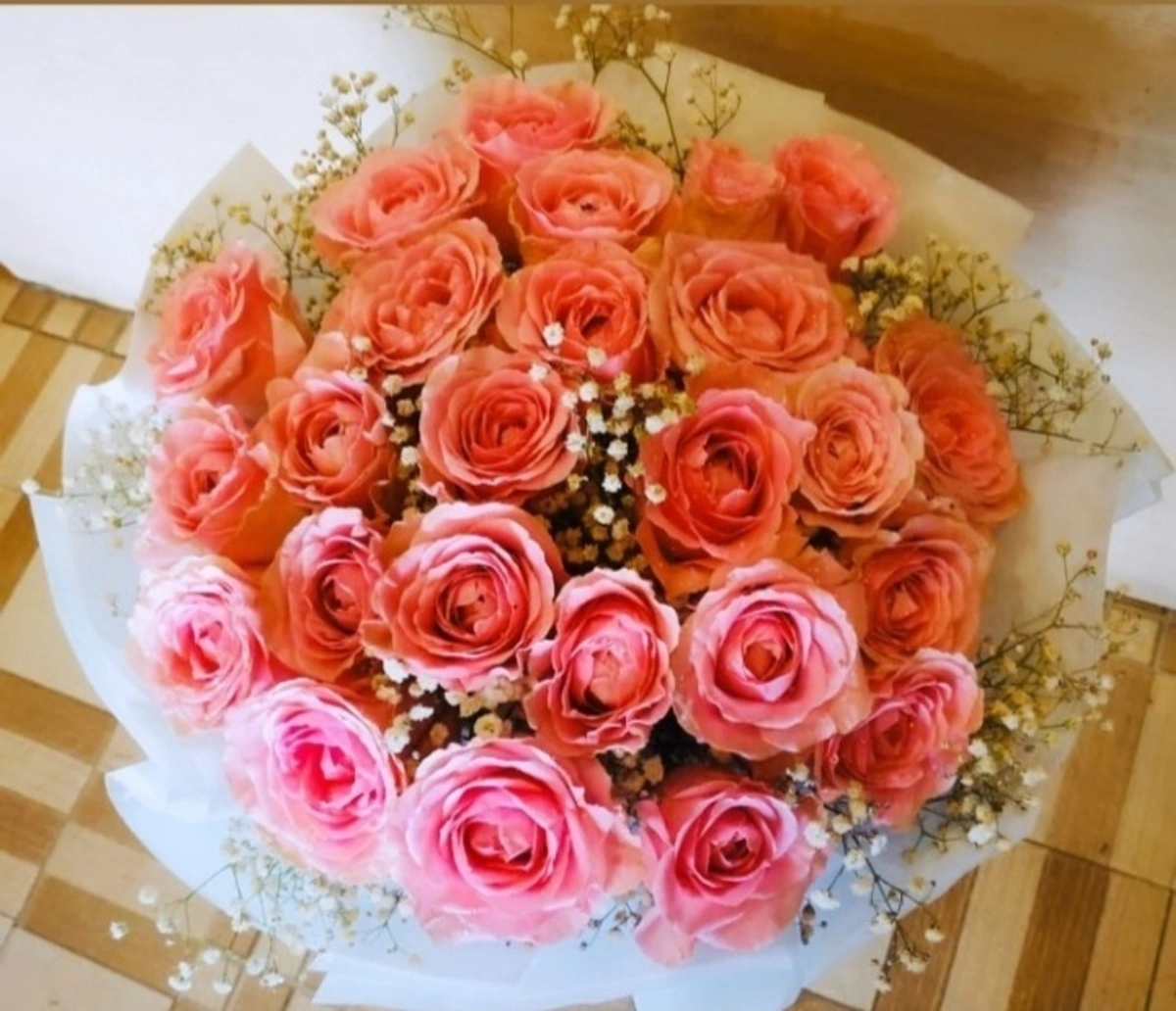 - Delicate Accents: Nestled among the roses are sprigs of White Gipsy, adding a whisper of whimsical charm and a dash of sophistication. This contrast not only enhances the pink hues but also symbolizes purity and love.