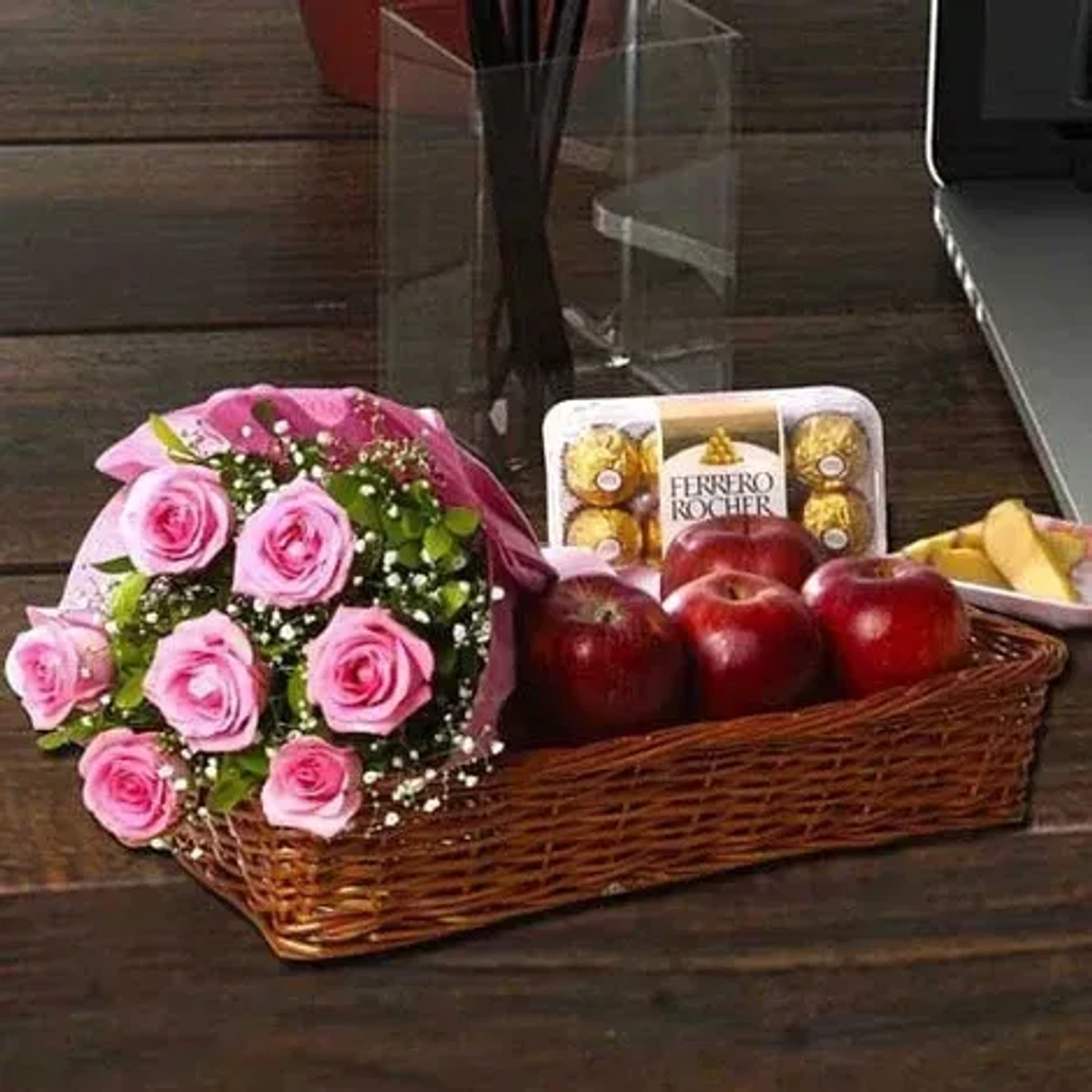 Indulge in the perfect blend of elegance and sweetness with our Pink Rose Bunch with Fruits and Chocolate, exclusively from Flowers-n-Gifts. This meticulously curated basket is designed to enchant the senses and deliver a message of love and appreciation.